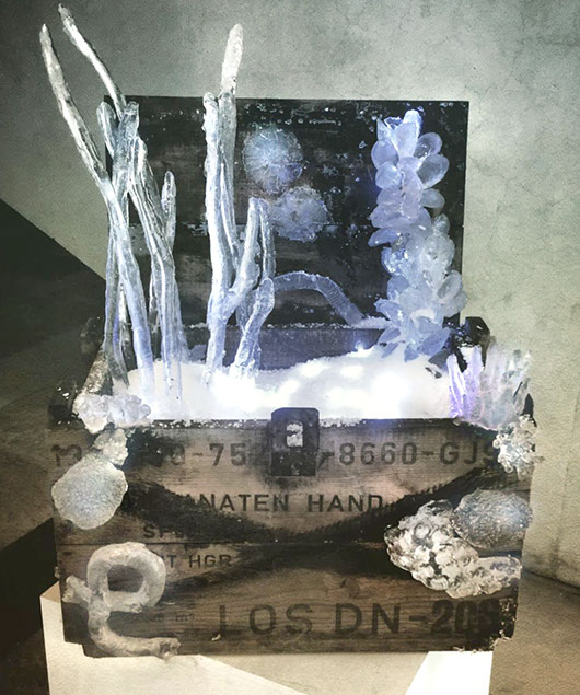 Alkali è un progetto di purificazione alchemica dal male dell’umanità attraverso il sale del mare. L'antica cassa di legno aveva contenuto bombe granate durante la seconda guerra mondiale. L’ho fisicamente immersa nelle profondità marine e lasciata lì per settimane a farsi permeare e lasciarsi mangiare dall’acqua salata. L’ho poi “pescata” e lasciata asciugare. E’ iniziato a questo punto il mio intervento plastico, in cui ho creato forme organiche, alghe, molluschi, spugne, rimaste cristallizzate sopra al legno, aggrappate come cristalli puri alla materia proveniente dalla guerra per annullarne il dolore, a memoria dell’esorcismo agito dalla forza della Natura sugli errori dell’umanità. La potenza magica del mare è semplicemente antidoto al male.